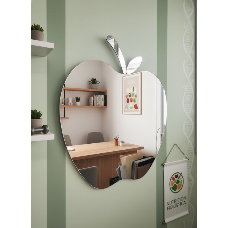Espejo decorativo en forma de MANZANA.Un detalle original ideal para consultorios de nutrición, espacios saludables o decoración del hogar. Instalación: Montaje sencillo y seguro en pared. (tornillería incluida).